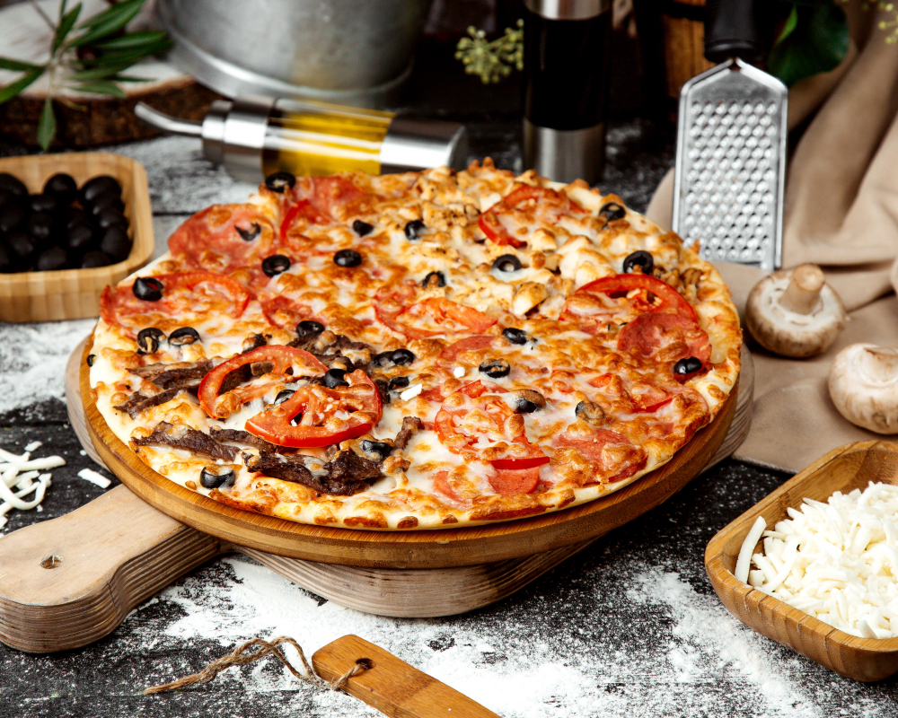Pepperoni, Mushrooms, Ham, Tomatoes, Green Peppers and Red Onions